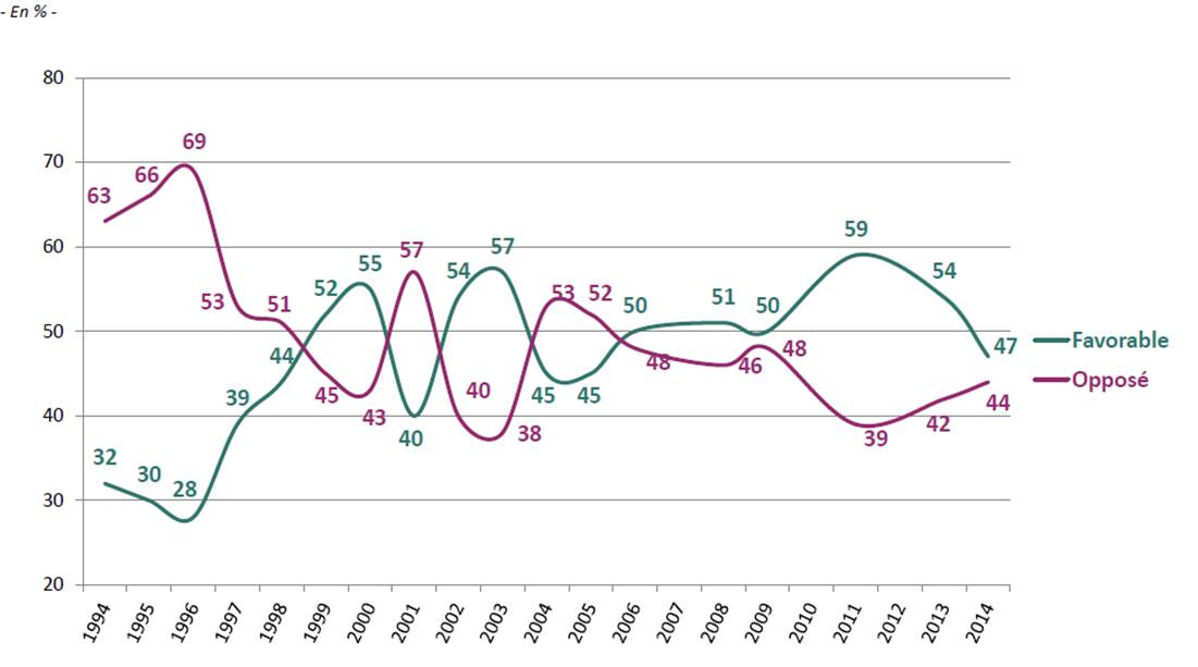 Il y a vingt ans, notre premier sondage montrait quun tiers seulement des personnes interrogées se déclarait favorable au droit de vote des étrangers non communautaires et à légalité des droits politiques entre les ressortissants de lUnion européenne et les autres étrangers. À partir de 1997, la tendance a évolué vers une meilleure reconnaissance de ces droits et, après des résultats en dents de scie, depuis 2006, les « favorables » sont plus nombreux que les « opposés ».