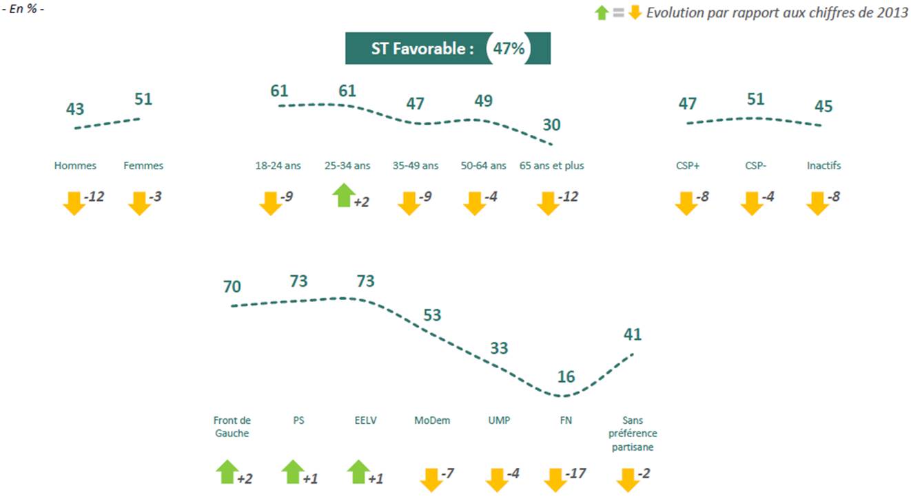 Dans un contexte difficile où les immigrés servent à nouveau de boucs émissaires aux difficultés financières dun grand nombre et où lattentisme des politiques sur les droits des étrangers est devenu la règle, les résultats du sondage de 2014, même si le pourcentage de favorables a diminué par rapport aux années précédentes, sont encourageants. Ladhésion au droit de vote des étrangers reste bien ancrée chez les catégories les plus jeunes de la population et chez les sympathisants de gauche. À noter une nette majorité de favorables chez les proches du MoDem, même si le pourcentage a diminué par rapport à 2013.