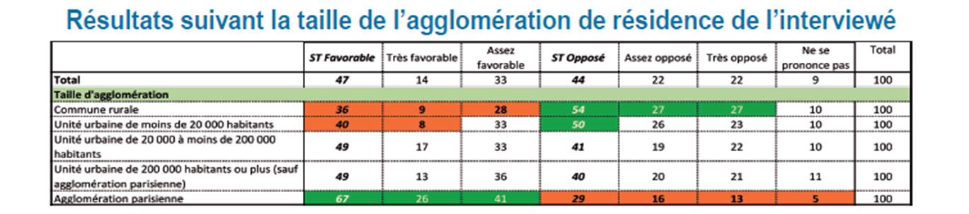 Les incertitudes du moment se traduisent aussi par un pourcentage inhabituel de personnes qui ne se prononcent pas sur la question posée, 9 %, niveau jamais atteint dans aucun de nos sondages précédents ; et celles qui par ailleurs indiquent navoir aucune préférence partisane se retrouvent nombreuses dans cette catégorie qui ne choisit pas, 23 %. Il y a peu de différences par rapport à la catégorie socioprofessionnelle de linterviewé. Par contre, comme les années précédentes, la taille du lieu de résidence est très discriminante : le pourcentage de favorables augmente avec la taille de lagglomération, 67 % en agglomération parisienne, et les opposés sont surtout nombreuxdans les communes rurales, 54 %.